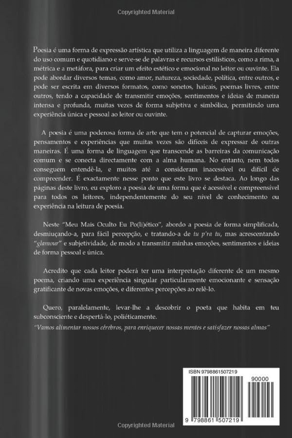“DO MEU MAIS OCULTO EU PO(LI)ÉTICO” é mais do que um livro de poemas; é uma jornada de autodescoberta, uma celebração da linguagem e uma oportunidade de dar asas à sua criatividade. Seja você um amante da poesia ou alguém que nunca ousou escrever uma única estrofe, este livro o encantará, desafiando-o a despertar o poeta que habita no seu mais profundo e oculto eu. Por isso, aquira este livro e abrace a poesia, abra as portas da sua imaginação e deixe-se levar pela magia das palavras. Esta é a chave para desvendar o poeta dentro de você e permitir que suas palavras ecoem através do tempo e da eternidade.